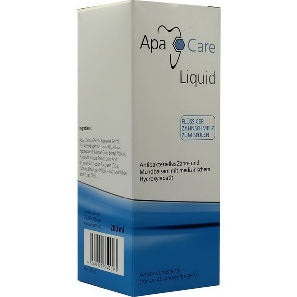 Antibakterielles Zahn- und Mundbalsam mit medizinischem Nano-Hydroxylapatit. Beim Spülen legen sich die Hydroxylapatit-Mineralien auf die Zähne, in Zahnzwischenräume, in Risse und Defekte ab. Die Zähne werden angenehm glatt, und glänzend. Die ätherischen Öle bekämpfen pathogene Biofilme. ApaCare Liquid ist alkoholfrei.