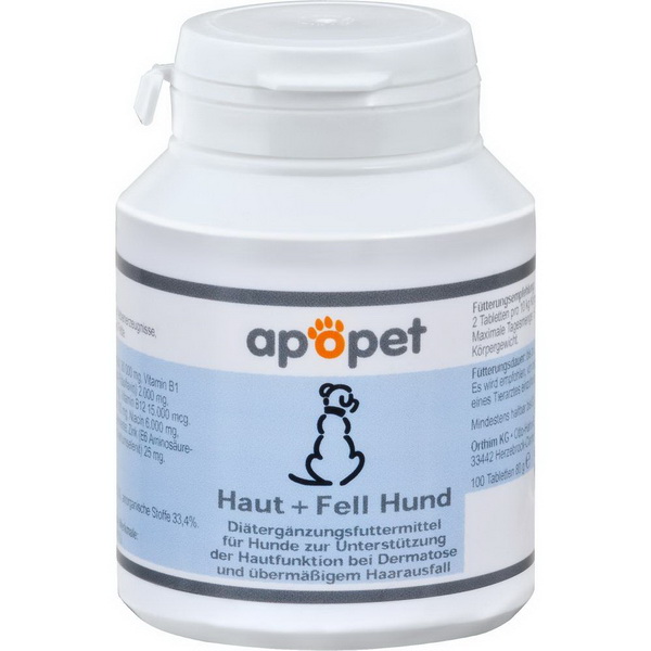 apopet Haut + Fell Hund sind vitamin- und kollagenreiche Tabletten für Hunde. Sie können unabhängig vom Haut- und Felltyp verwendet werden. Belohnen Sie Ihren Liebling und sein Fell durch die einfach anzuwendenden, schmackhaften Vitabletten jeden Tag!