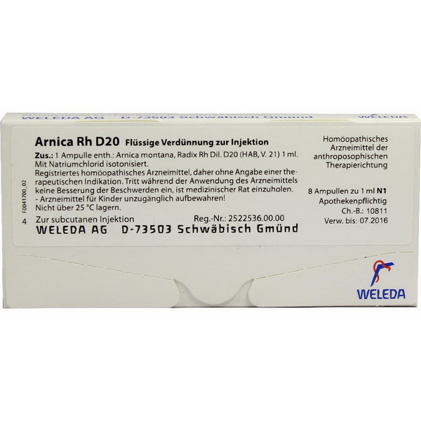1 Ampulle enthält: Wirkstoff: Arnica montana, Radix Rh Dil. D3 1 ml (HAB, V.21). Mit Natriumchlorid isotonisiert.