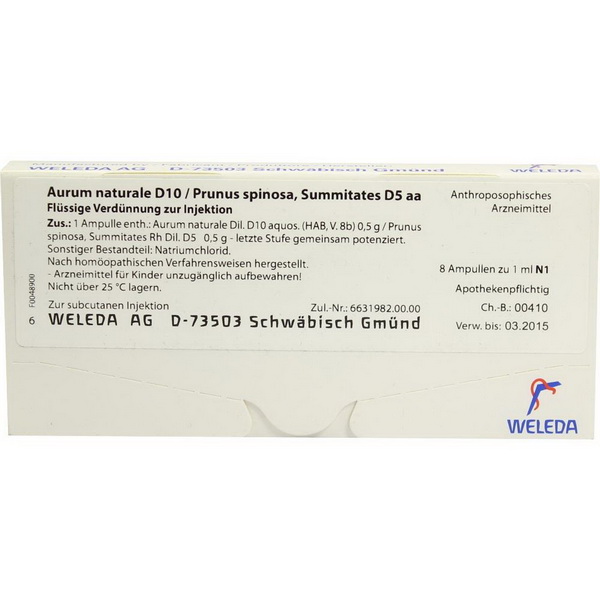 1 Ampulle enthält: Wirkstoffe: Aurum naturale Dil. D10 aquos. (HAB, V. 8b) 0,5 g / Prunus spinosa, summitates Rh Dil. D5 0,5 g - letzte Stufe gemeinsam potenziert.