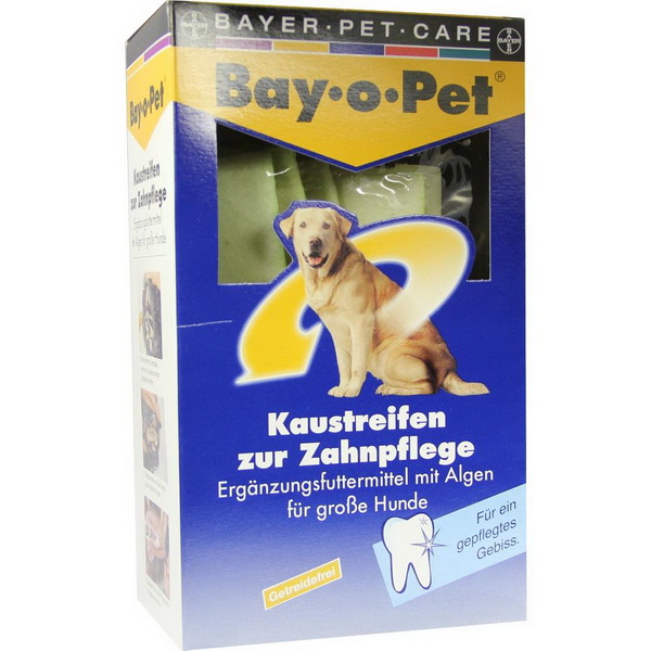 Bay·o·Pet® Zahnpflege Kaustreifen trainieren die Kaumuskulatur und pflegen das Gebiss unter Ausnützung des natürlichen Kautriebes des Hundes. Zähne und Zahnfleisch werden mechanisch gereinigt. Während des Kauens werden vermehrt natürliche Enzyme freigesetzt, die die Zähne zusätzlich von Zahnbelag befreien und so vor Zahnstein und Parodontose schützen können. Bay·o·Pet® Zahnpflege Kaustreifen bestehen aus echter Rinderhaut und sind mit einer ausgewählten, sehr nährstoffreichen Seealge beschichtet. Der Hund erhält so zusätzlich biologisch-hochwertige Vitamine, Mineralstoffe und Spurenelemente. Zusätzlich enthalten die Kaustreifen eine Vielzahl von wertvollen Milcheiweißen, die sich durch ihren hohen Gehalt an Aminosäuren auszeichnen.