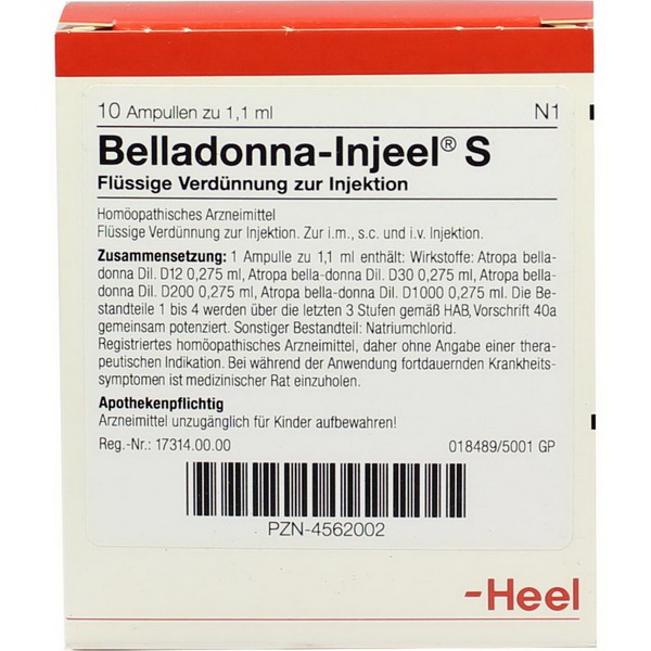 1 Ampulle zu 1,1 ml enthält: Wirkstoffe: Atropa belladonna Dil. D12 0,275 ml, Atropa bella-donna Dil. D30 0,275 ml, Atropa belladonna Dil. D200 0,275 ml, Atropa bella-donna Dil. D1000 0,275 ml. Die Bestandteile 1 bis 4 werden über die letzten 3 Stufen gemäß HAB, Vorschrift 40a gemeinsam potenziert.