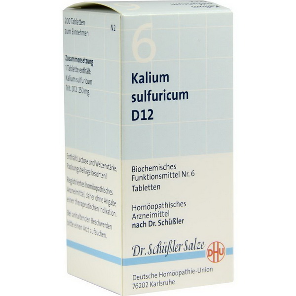 1 Tablette enthält: Kalium sulfuricum Trit. D12 250 mg.
