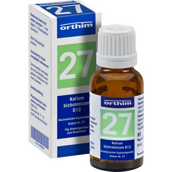 15,0 g Streukügelchen enthalten: Kalium bichromicum D12 15,0 g.