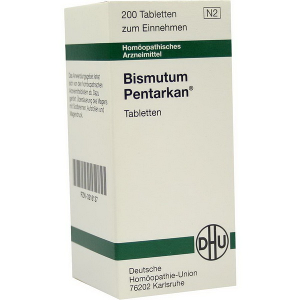 1 Tablette enthält: Wirkstoffe: Bismutum subnitricum Trit. D2 25 mg, Capsicum Trit. D5 25 mg, Robinia pseudacacia Trit. D5 25 mg, Iris Trit. D3 25 mg, Arsenicum album Trit. D5 25 mg.