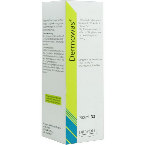 Dermowas® ist ein desinfizierendes und entfettendes Konzentrat zur Herstellung einer Lösung zur Anwendung auf der Haut. Dermowas® wird angewendet als äußerliche (externe) Zusatztherapie bei Hautmykosen (Hautpilzerkrankungen), Akne vulgaris und Dermatosen (Hauterkrankungen) des seborrhoischen (übermäßig talgproduzierenden) Formenkreises.