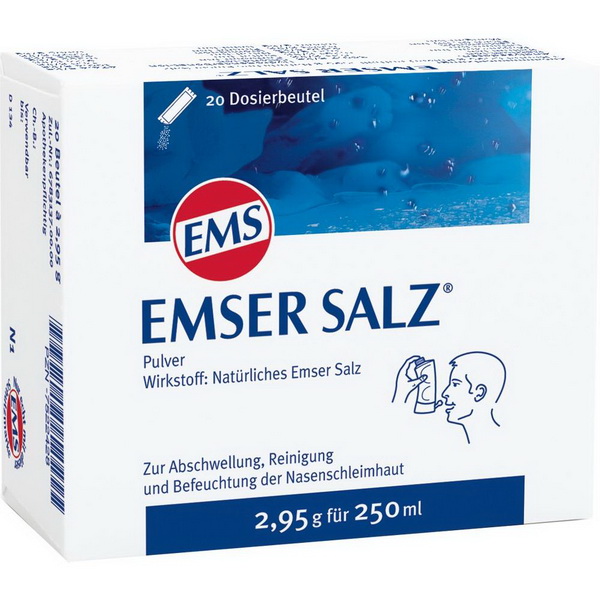 Allgemeine Informationen zu Emser Salz® BeutelEmser Salz® 2,95 g ist ein Pulver zur Abschwellung, Reinigung und Befeuchtung der Nasenschleimhaut. Es dient zur Herstellung von je 250 ml Nasenspüllösung.