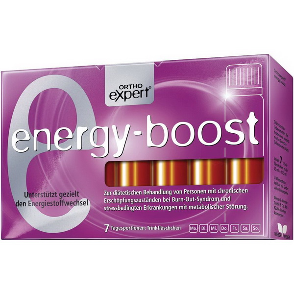 In jedem Boost-Fläschchen steckt eine einzigartige Verbindung aller entscheidenden Mikronährstoffe zur schnellen Stärkung des Energiestoffwechsels: Hoch dosiertes L-Carnitin aktiviert den Energiestoffwechsel. Eisen und Vitamin B12 fördern die Energieerzeugung im Organismus und helfen gegen Abgeschlagenheit. Darüber hinaus liefert Orthoexpert Energy-boost sekundäre Pflanzenstoffe wie Citrus-Bioflavonoide und Carotinoide sowie zahlreiche weitere Mikronährstoffe wie Zink und Magnesium, die den Körper bei starker geistiger und körperlicher Belastung unterstützen und Vitalität zurückgeben. In Phasen besonderer Herausforderungen profitiert der Energiestoffwechsel sehr rasch von Energy-boost, das, angeboten als Wochen- oder Monatskur, für die langfristige Einnahme geeignet ist. Energy-boost ist eine ergänzende bilanzierte Diät. Es enthält keine künstlichen Süßstoffe, ist lactose- und glutenfrei.