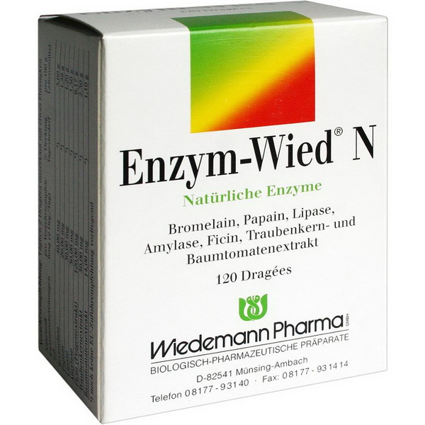 Zucker, Füllstoff: Calciumcarbonat, Vedickungsmittel: mikrokristalline Cellulose, ficinhaltiger Feigenextrakt (9,2 %), Stabilisator: Talkum, Bromelain (6,8 %), Ananasfruchtpulver (6,5 %), Papayafruchtpulver (6,1 %), Traubenkernextrakt (3,3 %), Lipase (2,3 %), Amylase (2,3 %), Stabilisator: Polyvinylpyrrolidon, Verdickungsmittel: Gummi arabicum, Stabilisator: vernetzte Natriumcarboxymethyl-cellulose, Farbstoff: Titandioxid, Stabilisator: Siliciumdioxid, Papain (1,5 %), Maisstärke, Baumtomatenextrakt (1,1 %), Stabilisator: Mono- und Diglyceride von Speisefettsäuren, Trennmittel: Magnesiumsalze der Speisefettsäuren, Zinkcitrat, Überzugsmittel Schellack, Feuchthaltemittel: Glycerin, Farbstoff: Eisenoxide und Eisenhydroxide, Emulgator: Polyoxyethylensorbitanmonooleat, Überzugsmittel: Carnaubawachs, Bienenwachs weiß.