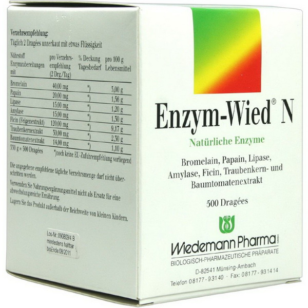 Zucker, Füllstoff: Calciumcarbonat, Vedickungsmittel: mikrokristalline Cellulose, ficinhaltiger Feigenextrakt (9,2 %), Stabilisator: Talkum, Bromelain (6,8 %), Ananasfruchtpulver (6,5 %), Papayafruchtpulver (6,1 %), Traubenkernextrakt (3,3 %), Lipase (2,3 %), Amylase (2,3 %), Stabilisator: Polyvinylpyrrolidon, Verdickungsmittel: Gummi arabicum, Stabilisator: vernetzte Natriumcarboxymethyl-cellulose, Farbstoff: Titandioxid, Stabilisator: Siliciumdioxid, Papain (1,5 %), Maisstärke, Baumtomatenextrakt (1,1 %), Stabilisator: Mono- und Diglyceride von Speisefettsäuren, Trennmittel: Magnesiumsalze der Speisefettsäuren, Zinkcitrat, Überzugsmittel Schellack, Feuchthaltemittel: Glycerin, Farbstoff: Eisenoxide und Eisenhydroxide, Emulgator: Polyoxyethylensorbitanmonooleat, Überzugsmittel: Carnaubawachs, Bienenwachs weiß.