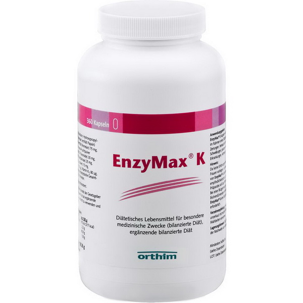 EnzyMax® K: Diätetisches Lebensmittel für besondere medizinische Zwecke (ergänzende bilanzierte Diät). EnzyMax® K ist ein hochdosiertes Enzympräparat zur Behandlung von Prellungen, Zerrungen, Verstauchungen, Muskel- und Gelenkschmerzen, Schwellungen, postoperativen Ödemen, rheumatischen Erkrankungen und Arthrosen. EnzyMax® K enthält natürliche Nährstoffe, Vitamine und sonstige Vitalstoffe, die geeignet sind, die Beschwerden bei o.g. Patienten positiv zu beeinflussen und die in dieser Menge durch die normale Ernährung nicht regelmäßig aufgenommen werden.