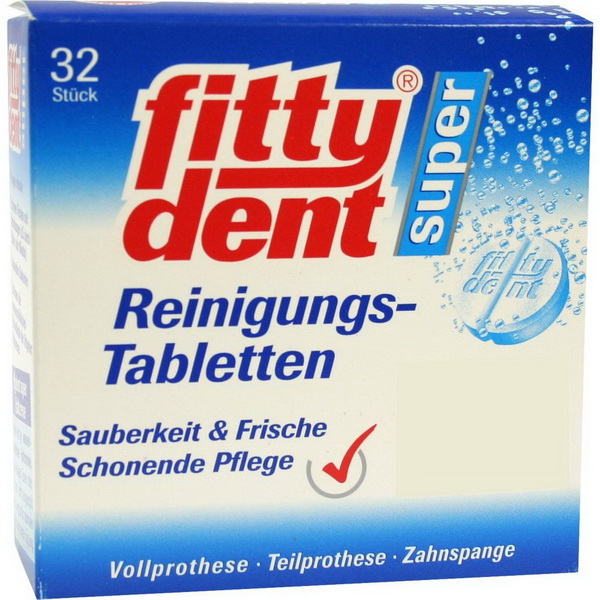 Fittydent super Reinigungstabletten reinigen die dritten Zähne intensiv, entfernen Flecken, bekämpfen Bakterien und entfernen die Klebereste von Fittydent-super-Haftkleber.