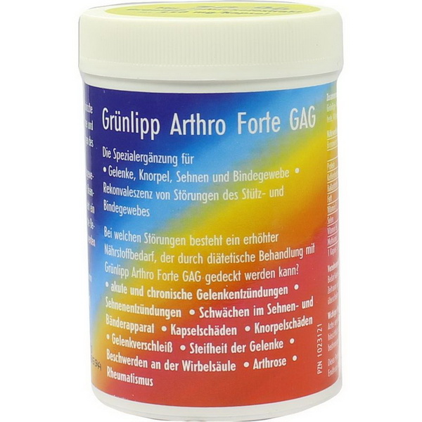 Grünlipp Arthro Forte GAG ist ein diätetisches Lebensmittel für besondere medizinische Zwecke (bilanzierte Diät) und zur diätetischen Behandlung von Arthrose und Rheumatismus, sowie von Störungen des Stütz- und Bindegewebes.