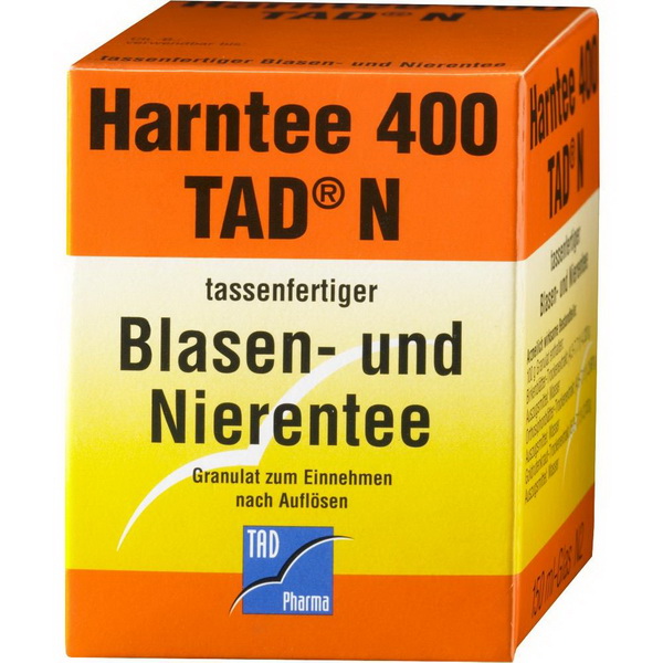 Harntee 400 TAD N ist ein pflanzliches Arzneimittel zur Durchspülung der Harnwege. Harntee 400 TAD N wird angewendet zur Durchspülung bei entzündlichen Erkrankungen der ableitenden Harnwege und als Vorbeugung bei Nierengrieß. Bei Blut im Urin, bei Fieber oder bei Anhalten der Beschwerden über 5 Tage muss ein Arzt aufgesucht werden