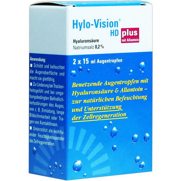 Hylo-Vision® HD plus Augentropfen enthalten 0,2 % hochgereinigtes Natriumhyaluronat und Allantoin in Phosphatgepufferter Kochsalzlösung mit Polyhexanid, einem sanften Konservierungsmittel. Natriumhyaluronat ist eine natürliche Substanz, die auch im menschlichen Auge vorkommt. Das eingesetzte Natriumhyaluronat ist nicht tierischen Ursprungs, sondern wird fermentativ gewonnen. Allantoin ist ein pflanzlicher Wirkstoff, der beispielsweise aus der Pflanze Beinwell gewonnen wird. Der Flascheninhalt wurde durch Filtration sterilisiert; die Keimfreiheit ist nur bei unversehrter Flasche gewährleistet.