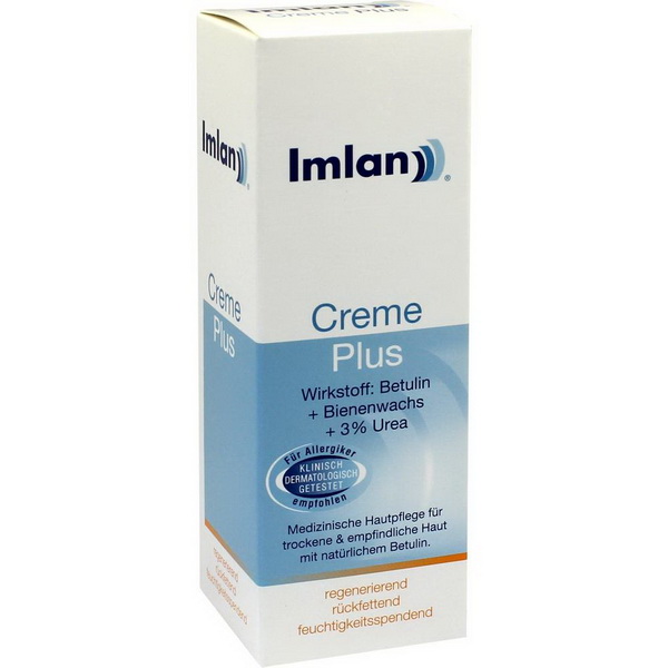 Die Imlan Creme Plus schützt und pflegt trockene und zu Entzündungen neigende Haut mit dem natürlichen Wirkstoff Betulin sowie Bienenwachs und 3% Urea. Das Hautbild wird verbessert, die Hautfeuchtigkeit und damit die Geschmeidigkeit der Epidermis erhöht. Um Ihre Haut im Gleichgewicht zu halten, tragen Sie Imlan Creme Plus regelmäßig auf.