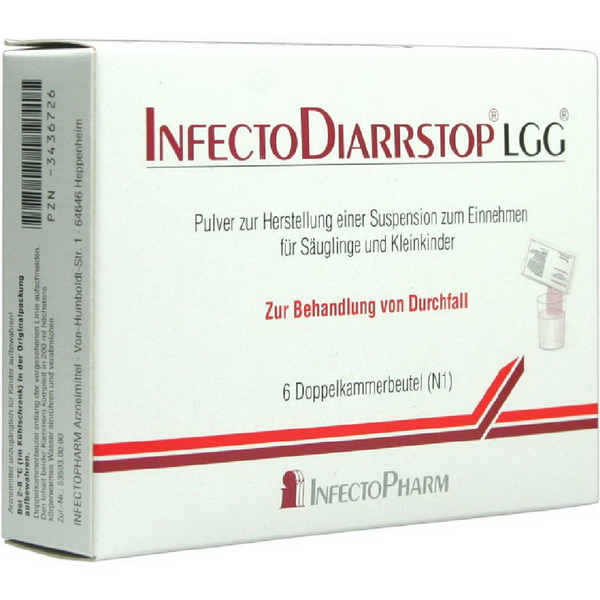 INFECTODIARRSTOP LGG enthält einen lebensfähigen Mikroorganismus (Milchsäurebakterium) zur Durchfallbehandlung sowie Salze und Kohlenhydrate zum Ausgleich von Salz- und Flüssigkeitsverlusten. INFECTODIARRSTOP LGG wird zur Behandlung von Durchfall (Diarrhö) bei Säuglingen und Kleinkindern eingesetzt.