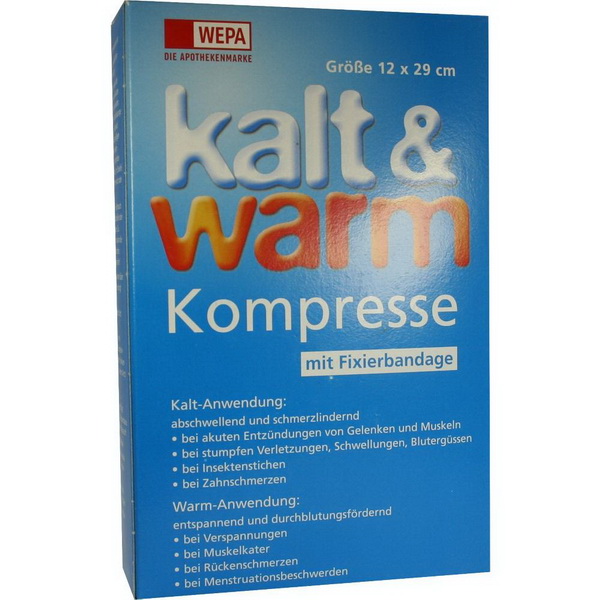 Kompresse mit Fixierbandage. Die Bandage verhindert das Verrutschen der Kompresse, so dass man in der Bewegungsfreiheit nicht ganz eingeschränkt ist. Durch die genaue Fixierung kann die Kompresse optimal den Schmerzpunkt mit der gewählten Temperatur versorgen.