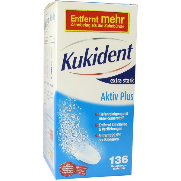 Kukident Aktiv Plus ermöglicht eine kraftvolle Tiefenreinigung, auch an Stellen, wo die Zahnbürste nicht hinkommt und entfernt mehr Zahnbelag als bei