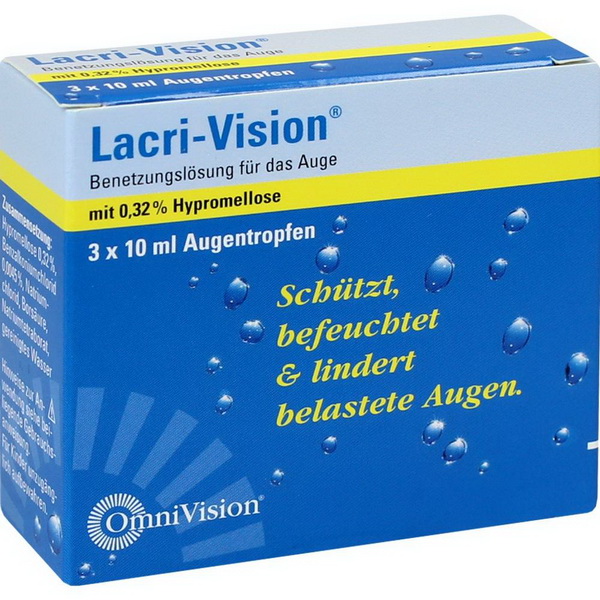 Lacri-Vision® ist eine sterile wässrige Lösung mittlerer Viskosität mit 0,32 % Hypromellose. Lacri-Vision® erfrischt und beruhigt belastete Augen und erhöht ihre Gleitfähigkeit. Lacri-Vision® hat eine schützende, befeuchtende Wirkung, die Trocken heitsgefühl auf Grund von Umwelteinflüssen, wie z. B. Klimaanlagen, Tabakrauch, Staub, Reizungen durch Sonneneinstrahlung oder Müdigkeit sowie lange Bildschirmarbeit, rasch und lang anhaltend lindert. Die viskositätserhöhende Substanz Hypromellose bildet auf dem Auge einen optisch klaren Schutz- und Gleitfilm, der die physiologischen Funktionen der fehlenden Tränenflüssigkeit übernimmt. Aufgrund seiner Viskosität besitzt Lacri-Vision® eine lange Verweildauer und ermöglicht so eine komfortable Anwendungsfrequenz. Lacri-Vision® hat folgende chemisch-physikalische Eigenschaften: es enthält eine klare Flüssigkeit, die zu allen Teilen wasserlöslich ist. Es entstehen keine Ausfällungen an metallischen Salzen oder organischen Residuen, die in die körpereigene Tränenflüssigkeit gelangen können. Der pH-Wert ist perfekt kompatibel mit dem Augengewebe und der Tränen flüssig - keit. Daher ist Lacri-Vision® besonders gut verträglich und beseitigt rasch das lästige Trockenheitsgefühl der Augen.