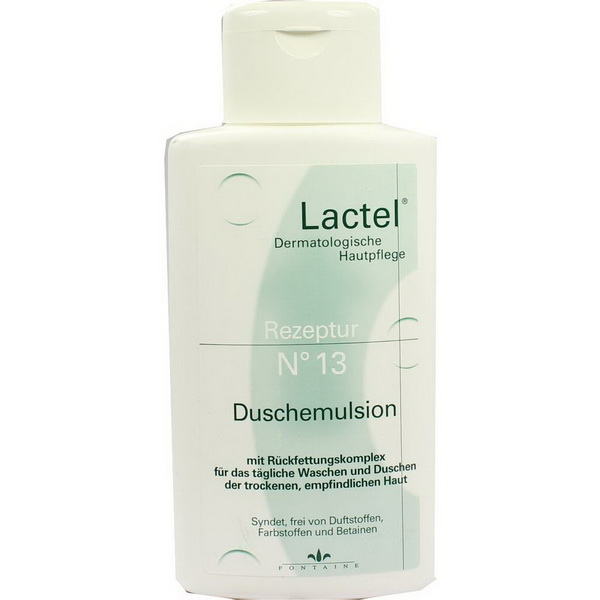 Lactel® N°13 Duschemulsion mit Rückfettungskomplex ist eine seifenfreie schonende Hautwaschemulsion, die speziell für das tägliche Waschen und Duschen trockener, empfindlicher Haut entwickelt wurde. Der spezielle Rückfettungskomplex der auch nach dem Waschen oder Duschen auf der Haut verbleibt, bewirkt eine ausgeprägte Rückfettung der Haut. So wird der erhöhte Wasserverlust vermindert und der Austrocknung der Haut entgegengewirkt. Der hautfreundliche pH-Wert erhält die Funktion des natürlichen Säureschutzmantels. So bleibt die Barrierefunktion der Haut intakt, die Haut wird auf natürliche Weise geschützt. Durch den Verzicht auf Betaine, Duft- und Farbstoffe sowie die Verwendung dermatologisch ausgewählter Inhaltsstoffe ist Lactel® N°13 besonders gut hautverträglich.
