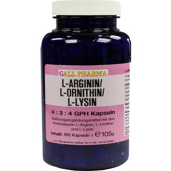L-Lysin HCl (25 %), L-Arginin (20 %), L-Ornithin HCl (19 %); Füllstoff: Mannit (kann bei übermäßigem Verzehr abführend wirken); Kapselhülle: Gelatine; Farbstoffe in der Kapselhülle: Titandioxid, Eisenoxid, Ponceau 4 R, Chinolingelb (Kann Aktivität und Aufmerksamkeit bei Kindern beeinträchtigen!), Patentblau V