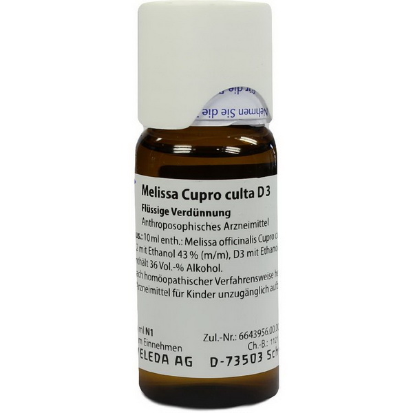 10 ml enthalten: Wirkstoff: Melissa officinalis Cupro culta, Herba Dil. D2 10 ml [HAB, V. 3a; D2 mit Ethanol 43% (m/m), D3 mit Ethanol 30 % (m/m)] 10 ml.
