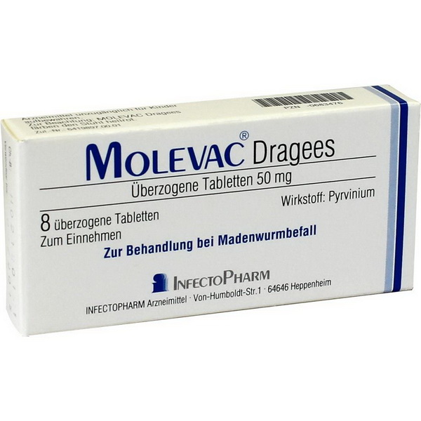 MOLEVAG ist ein Mittel zur Behandlung bei Madenwurmbefall (Oxyuriasis). MOLEVAG kann angewendet werden bei Kindern ab 3 Jahren, Jugendlichen und Erwachsenen. Der in MOLEVAG enthaltene Wirkstoff Pyrvinium ist speziell gegen Madenwürmer (Oxyuren) wirksam. Die wurmabtötende Wirkung beruht auf einer Störung des Stoffwechsels der Madenwürmer durch MOLEVAG.
