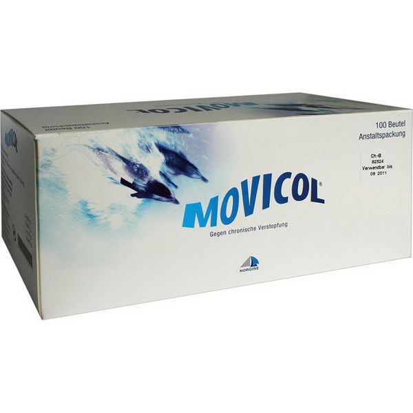 MOVICOL® ist zur Anwendung bei chronischer Verstopfung bestimmt und in Beuteln à 13,81 Pulver erhältlich. An arzneilich wirksamen Bestandteilen enthält das Pulver Macrogol (Polyethylenglykol) 3350, Natriumchlorid, Natriumhydrogencarbonat und Kaliumchlorid.