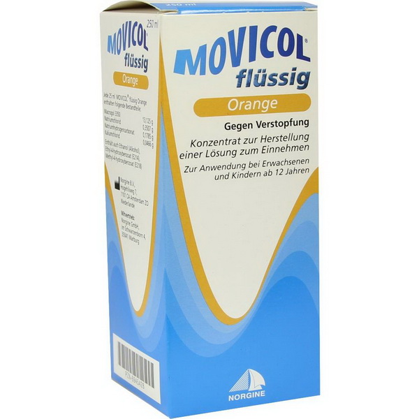 MOVICOL® flüssig Orange wird als flüssiges Konzentrat in den Packungsgrößen 250 ml, 500 ml und 1000 ml angeboten. Aufgrund der flüssigen Darreichungsform lässt sich MOVICOL® flüssig Orange äußerst flexibel dosieren. Wie bei den übrigen Präparaten der MOVICOL®-Produktfamilie sind auch bei der flüssigen Form neben dem Wirkstoff Macrogol 3350 zusätzlich Elektrolyte zugesetzt. So bleibt der Elektrolythaushalt auch bei längerer Einnahme im Gleichgewicht.