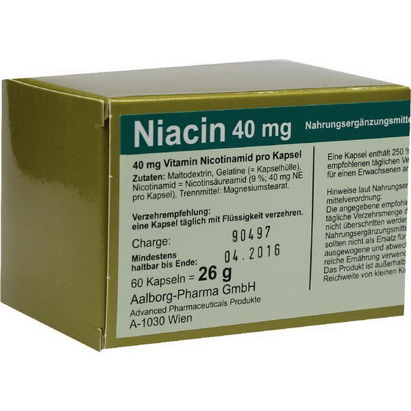 Maltodextrin, Gelatine (=Kapselhülle), Nicotinamid = Nicotinsäureamid (9%, 40 mg NE pro Kapsel), Trennmittel: Magnesiumstearat.