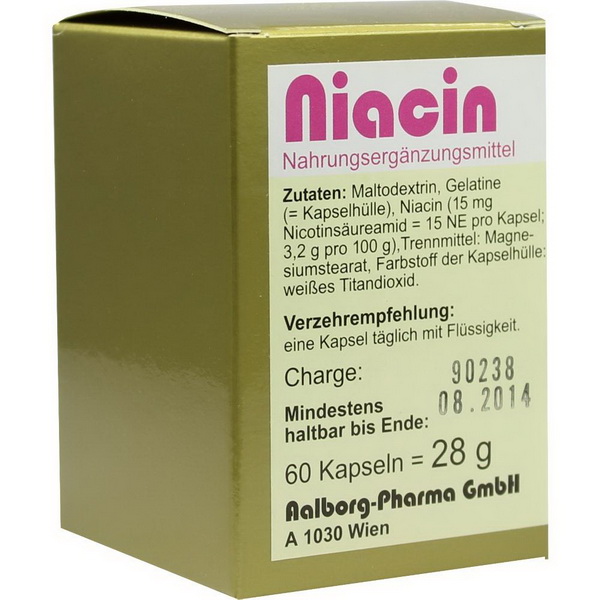 Maltodextrin, Gelatine (=Kapselhülle), Niacin (15 mg Nicotinsäuremid = 15 NE pro Kapsel; 3,2 g pro 100 g) Trennmittel: Magnesiumstearat, Farbstoff der Kapselhülle: weißes Titandioxid.