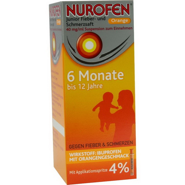 Nurofen® Junior Fieber - und Schmerzsaft Orange 40 mg/ml Suspension zum Einnehmen, Nurofen® Junior Fieber - und Schmerzsaft Erdbeer 40 mg/ml Suspension zum Einnehmen.