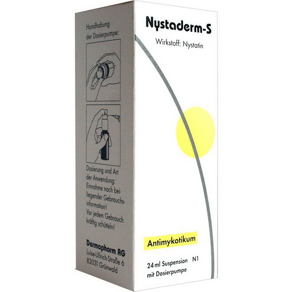 Nystaderm-S enthält den Wirkstoff Nystatin, der zur Behandlung von Pilzinfektionen (Antimykotikum) der Haut und Schleimhäute angezeigt ist.