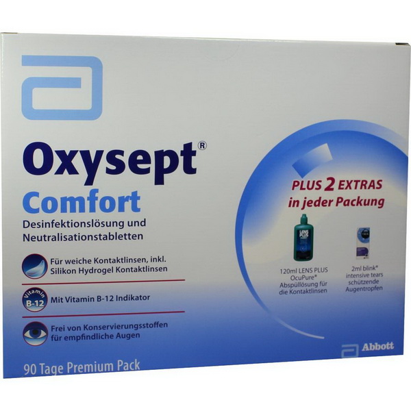 Oxysept® Comfort ist ein hochwertiges Tablettenperoxid-Pflegesystem für alle weichen Kontaktlinsen, auch für alle Austauschsysteme inkl. Silikon-Hydrogel-Kontaktlinsen. Oxysept® Comfort reinigt und desinfiziert Ihre Kontaktlinsen sicher und gründlich und ist dabei völlig frei von Konservierungsstoffzusätzen – für optimale Verträglichkeit. Oxysept® Comfort enthält das Augenvitamin B12, das als essenzielles Vitamin auch natürlich im Körper vorkommt. Es tönt die neutralisierte Oxysept® Comfort-Lösung zartrosa und gibt die Gewissheit, dass nichts vergessen wurde – für mehr Sicherheit. Nach sicherer Desinfektion (3 % Wasserstoffperoxid) und Bioneutralisation (rosa Tönung der Lösung) entfaltet sich die zusätzliche Benetzungswirkung der Tablette – für lang anhaltenden Tragekomfort.
