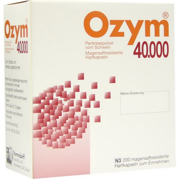 Ozym® 40.000 ist ein Präparat zum Ersatz von Verdauungsenzymen bei Verdauungsstörungen infolge ungenügender oder fehlender Funktion der Bauchspeicheldrüse. Ozym® 40.000 wird angewendet bei Störungen der exokrinen Pankreasfunktion (ungenügende oder fehlende Funktion der Bauchspeicheldrüse), die mit einer Maldigestion (Verdauungsstörung) einhergehen.