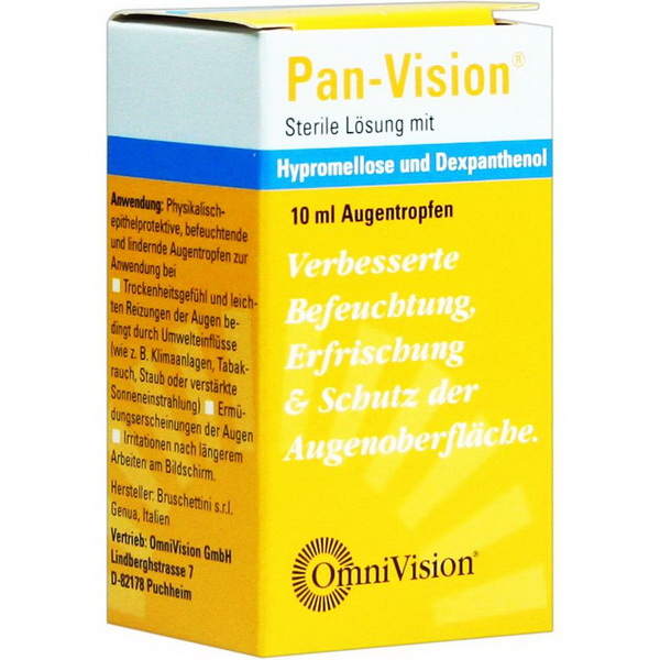 Zur Gesunderhaltung und optimalen Funktion der Auges müssen Binde- und Hornhaut ständig feucht gehalten werden. Durch Pan-Vision® erfolgt ein chemisch-physikalischer Schutz der Augenoberfläche. Der pH-Wert ist perfekt kompatibel mit dem Augengewebe und der Tränenflüssigkeit. Daher ist Pan-Vision® besonders gut verträglich und beseitigt rasch das lästige Trockenheitsgefühl.