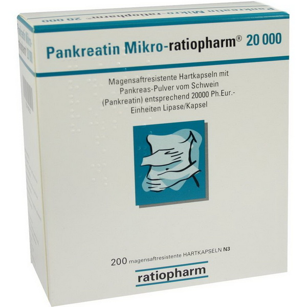 Pankreatin Mikro-ratiopharm®20 000 ist ein Arzneimittel, das verdauungsförderndeStoffe (Enzyme)aus der Bauchspeichel drüse (Pankreas)vom Schwein enthält.Es wird zur Behandlung vonVerdauungsstörungen verwendet,die durch eine verminderte oderfehlende Funktion der Bauchspeicheldrüseverursacht werden. SolcheVerdauungsstörungen könnensich z. B. als Bauchschmerzen,Blähungen, Fettstuhl oder Durchfall,als häufige Stuhlgänge oderGewichts verlust äußern.