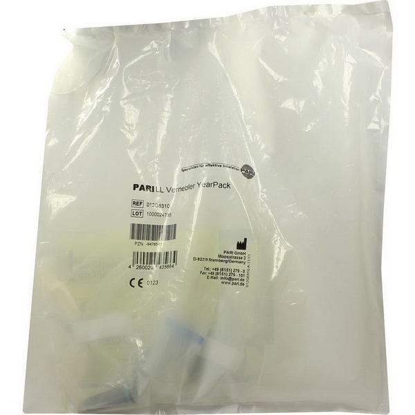 Bestehend aus Filter für PARI BOY® Kompressoren (ab Type 038), Düse, Medikamentenbecher, Mundstück universell, LL Adapter und Anschlussschlauch (1,2m)