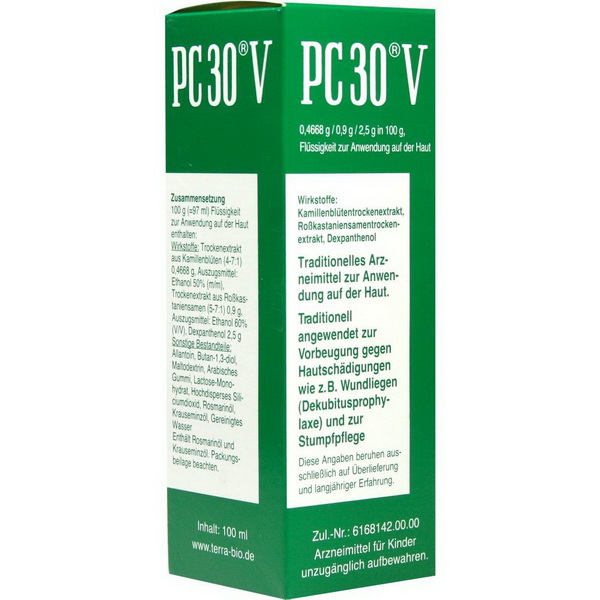 PC 30®V ist ein traditionelles Arzneimittel, das ausschließlich aufgrund langjähriger Anwendung für das Anwendungsgebiet registriert ist. Der Anwender sollte bei fortdauernden Krankheitssymptomen oder beim Auftreten anderer als der in der Packungsbeilage erwähnten Nebenwirkungen einen Arzt oder eine andere in einem Heilberuf tätige qualifizierte Person