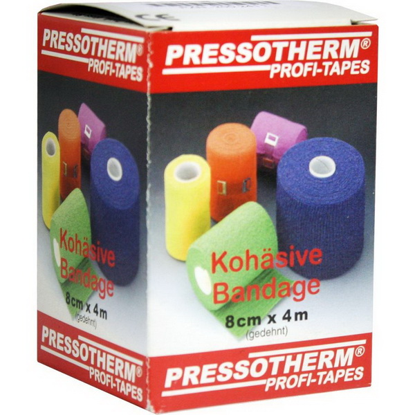 Kohäsive (=auf sich selbst haftend), elastische Fixierbinde für die Fixierung von Wundverbänden als Unterzug bei PRESSOTHERM Tape-Verbänden.