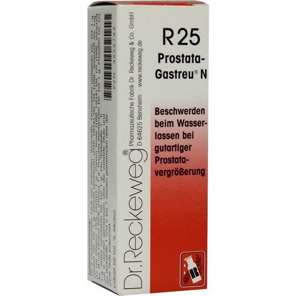 Prostata-Gastreu® N R 25 ist ein homöopathisches Arzneimittel bei Erkrankungen der männlichen Geschlechtsorgane. Anwendungsgebiete: Die Anwendungsgebiete leiten sich von den homöopathischen Arzneimittelbildern ab. Dazu gehören: Besserung der Beschwerden beim Wasserlassen bei gutartiger Prostatavergrößerung. Hinweis: Störungen der Blasenentleerung erfordern eine ärztliche Abklärung. Beim Auftreten von Blut- oder Schleimbeimengungen ist ein Arzt aufzusuchen. Bei allen unklaren und plötzlich einsetzenden Beschwerden sollte ein Arzt aufgesucht werden, da es sich um Erkrankungen handeln kann, die einer ärztlichen Abklärung und Behandlung bedürfen.