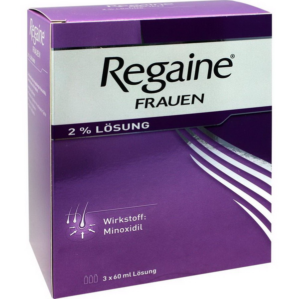 Wirkstoff: Minoxidil. Anwendungsgebiete: Regaine Frauen stabilisiert den Verlauf der androgenetischen Alopezie bei Frauen (charakteristische anlagebedingte diffuse Kopfhaarverdünnung im Parietalbereich) und kann so dem Fortschreiten dieser Alopezie entgegen wirken. Die Behandlung mit Regaine Frauen fördert das Haarwachstum und wirkt dem Fortschreiten der androgenetischen Alopezie entgegen. Warnhinweis: Enth. Propylenglycol.