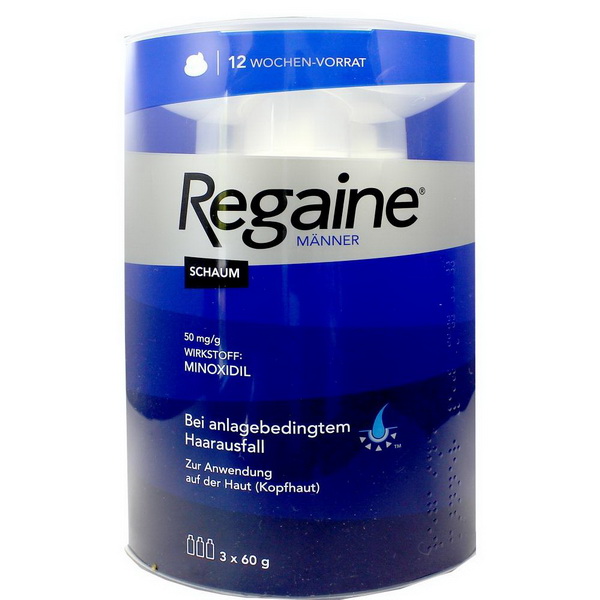 Wirkstoff: Minoxidil. Anwendungsgebiet: Regaine Männer Schaum stabilisiert den Verlauf des anlagebedingten Haarverlustes (androgenetische Alopezie) im Tonsurbereich der Kopfhaut bei Männern im Alter von 21–49 Jahren. Die Behandlung kann so dem Fortschreiten des anlagebedingten Haarverlustes entgegenwirken. Beginn und Ausmaß können individuell unterschiedlich sein und sind nicht vorhersagbar. Warnhinweis: Enth. Butylhydroxytoluol (E321), Cetylalkohol, Stearylalkohol.