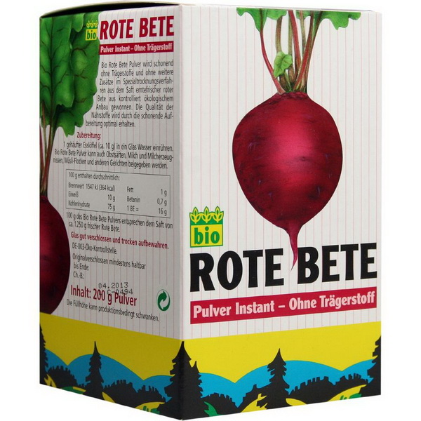 100 g des Bio Rote Bete Pulvers entsprechen dem Saft von ca. 1.250 g frischer Rote Bete.