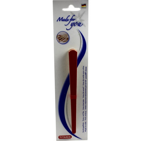 Sandnagelfeilen, 2-teilig, mit grobem Schmirgel (dunkle Seite) und mit feinem Schmirgel (helle Seite). Erst mit der dunklen Seite den Nagel in Form feilen und anschließend die helle Seite nutzen um einen feinen Abschluss zu erzielen.