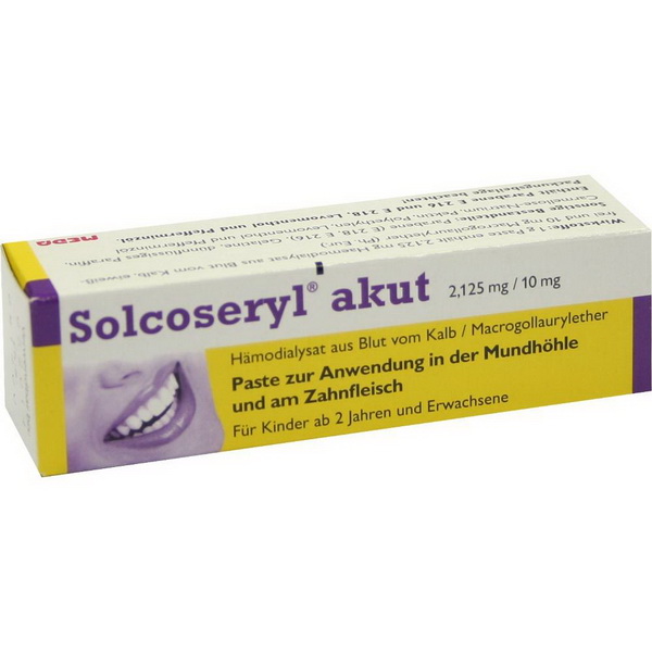 Solcoseryl ® akut ist eine fett- und wasserfreie Paste zur Anwendung in der Mundhöhle und am Zahnfleisch.