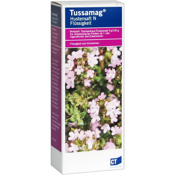 Tussamag Hustensaft N Tussamag Hustensaft N zuckerfrei Wirkstoff: Thymiankraut-Fluidextrakt Anwendungsgebiete Zur Besserung der Beschwerden bei Erkältungskrankheiten der Atemwege mit zähflüssigem Schleim und zur Besserung der Beschwerden bei akuter Bronchitis. Warnhinweise: Tussamag? Hustensaft N: Enthält 4 Vol.-% Alkohol und Saccharose (Zucker)! 20 ml Flüssigkeit enth. 13,25 g Saccharose (Zucker) entspr. ca. 1,10 BE. Tussamag? Hustensaft N zuckerfrei: Enthält 4 Vol.-% Alkohol und Sorbitol!. Apothekenpflichtig Zu Risiken und Nebenwirkungen lesen Sie die Packungsbeilage und fragen Sie Ihren Arzt oder Apotheker. Stand: Oktober 2012