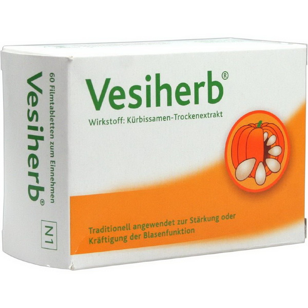 Vesiherb® (Wirkstoff: Kürbissamen-Trockenextrakt): Traditionelles pflanzliches Arzneimittel angewendet zur Stärkung oder Kräftigung der Blasenfunktion ausschließlich auf Grund langjähriger Anwendung. Zu Risiken und Nebenwirkungen lesen Sie die Packungsbeilage und fragen Sie Ihren Arzt oder Apotheker.