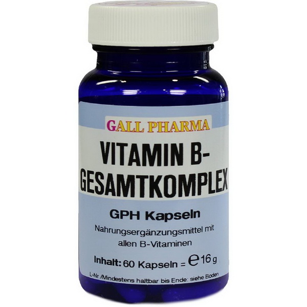 Vitamin B-Gesamtkomplex GPH Kapseln enthalten 3 mg Vitamin B1, 3 mg Vitamin B2, 3,6 mg Vitamin B6, 3 µg Vitamin B12, 100 µg Biotin, 18 mg Calciumpantothenat, 45 mg Niacin und 900 µg Folsäure in einer Hartgelatinekapsel. Die Kapseln enthalten die gesamten Vitamine des B-Komplexes in jener Menge, wie diese für die tägliche Ernährung empfohlen und unerlässlich sind. Die B-Vitamine haben Bedeutung für den Energiestoffwechsel, die Energieproduktion aus Fett, Eiweiß und Kohlenhydraten, Nerven, Blutbildung, Wachstum, Haut und Haare.